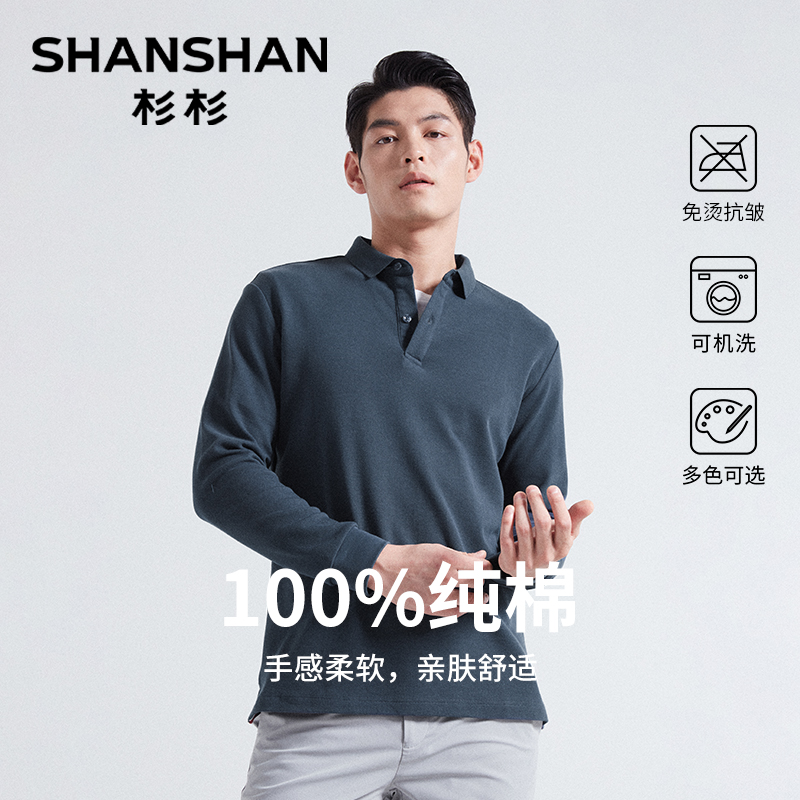 【【商d!】叠加淘金币6元,到手135.9!】杉杉新款长袖Polo衫,品质卓越,价格更优!秋季新款上市,翻领T恤,彰显男性魅力。高级感十足的纯棉面料,上身超舒适。下单链接: https://uland.taobao.com/item/edetail?id=066aWjgI7t8RZK2My6C0Vzs2t6-RgG3Qn8cXX99GMzXf6j