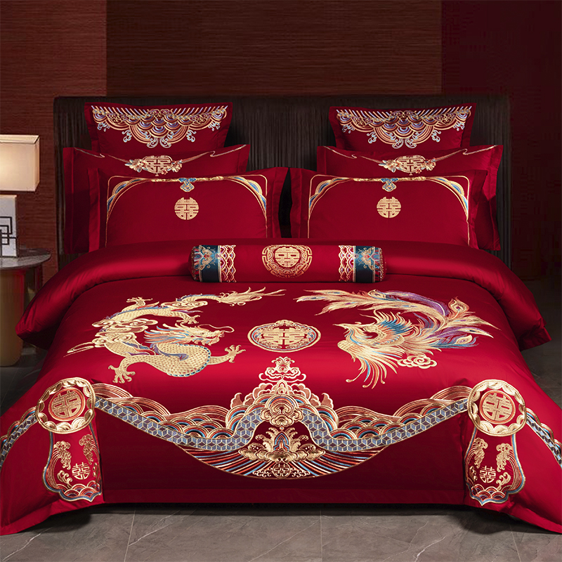 新中式长绒棉婚庆喜事龙凤刺绣四件套八件套