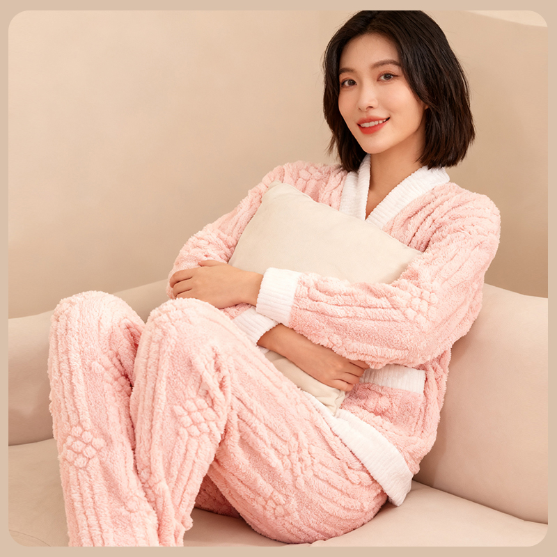 秋冬长袖睡衣女珊瑚绒开衫家居服套装,设计简约,兼具舒适与时尚,高品质的珊瑚绒,保持温暖。撞色领口的设计与V领长袖的结合,增加时尚感,不失舒适。下单链接: https://uland.taobao.com/item/edetail?id=NOOmMkrgF5tGX2kMv8JUxJ8hRtB-9za58Xoh5PmKQj33trO