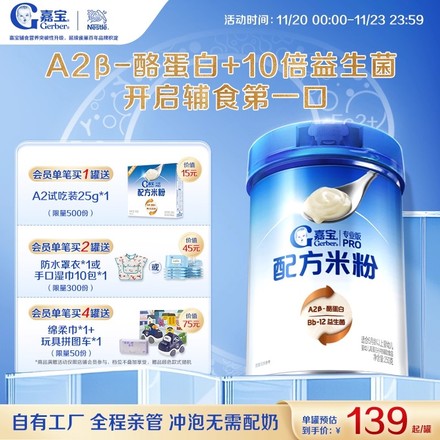 【券后139元,会员单笔买1赠A2试用装25g(限量500份),买2赠防水罩衣或手口湿巾10包(限量300份),买4罐送棉柔巾+玩具拼图车(限量50份)】嘉宝辅食营养突破性升级,延续雀巢百年品牌积淀!首·个配方米粉系列,肚肚舒适双子星,营养亲和好吸收!嘉宝配方米粉,A2β-酪蛋白好吸收,优惠来袭!宝宝营养必备,嘉宝A2β-酪蛋白益生菌米粉,低价特惠,嘉宝A2β-酪蛋白,高铁低敏,助成长下单链接: https://uland.taobao.com/item/edetail?id=GyGabbNu8tYqoZkd94sYqjTQtJ-zD03ZyKIo887p6MYSz