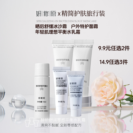 9.85元任选3件!姸修原精简护肤旅行装,晒后舒缓冰沙霜户外特护面霜年轻肌理想平衡水乳霜。下单链接: https://uland.taobao.com/item/edetail?id=XqqybDx9iGtXQ3YwZwqCVAXcBtg-XqGwrmpu0b7Zqvx4Sg