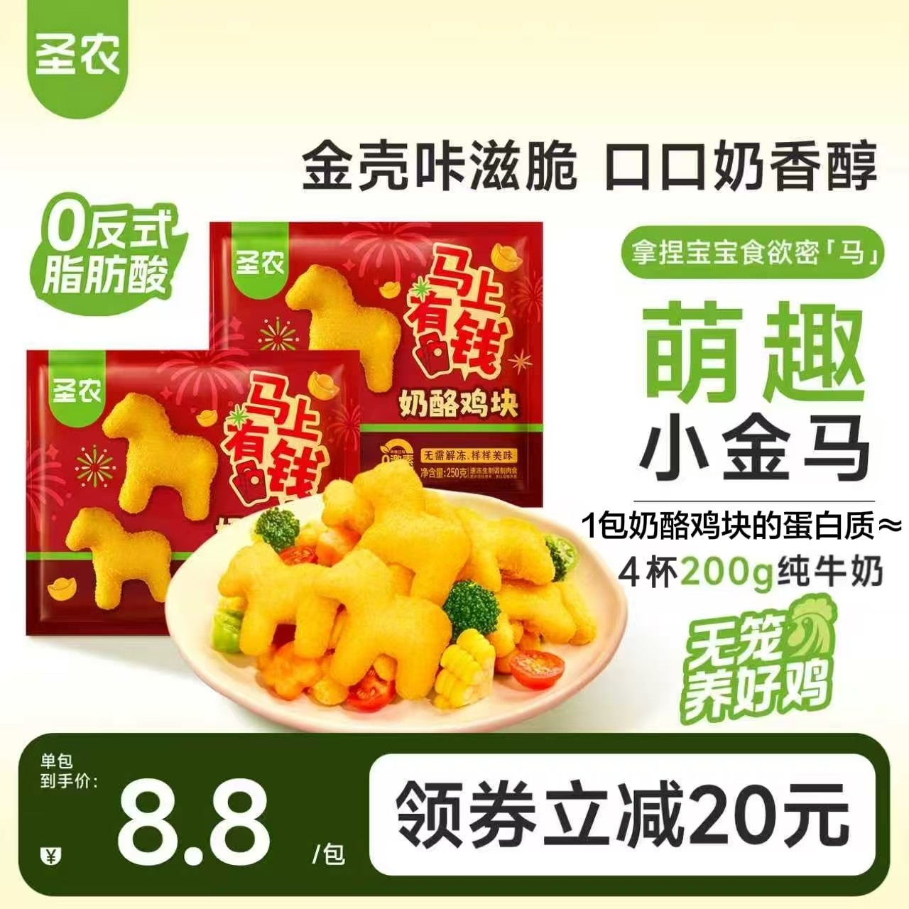 马年尝鲜好时机!圣农奶酪鸡块250g×8包上新啦,空气炸锅一炸,外酥里嫩,奶酪香浓。下单官方立减38元,淘金币抵7.65元,红包券再减6元,凑单后仅47.65元,速抢!下单链接: https://uland.taobao.com/item/edetail?id=XZRkYqZSGtXQe2xKm6iVgwIBtg-YJGeOZNHjo8qRapQfRW