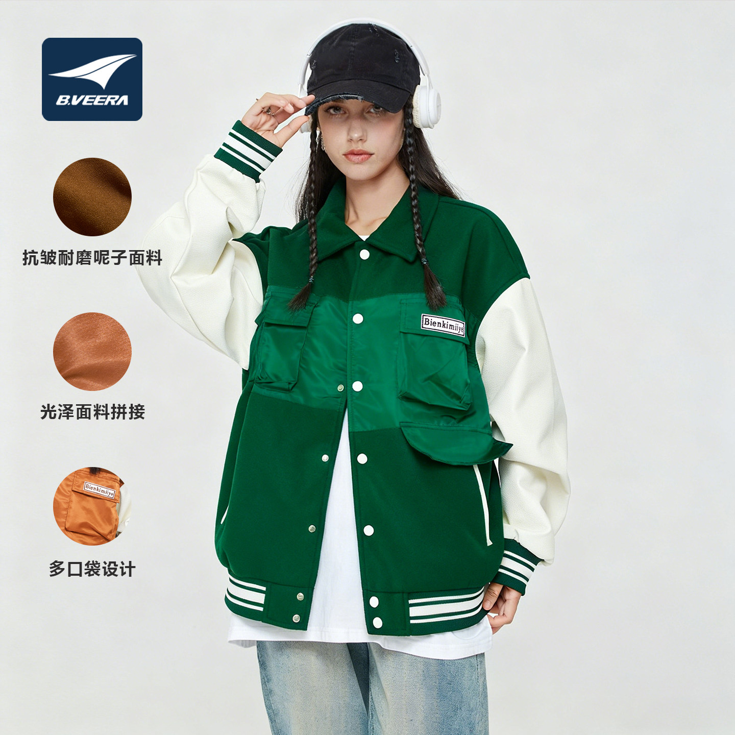 倍福来美式复古拼接棒球服秋冬宽松加厚外套