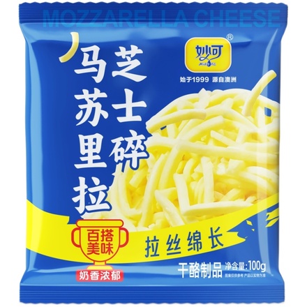 妙可马苏里拉芝士碎拉丝奶香,口感顺滑,奶香四溢,色泽淡黄,拉丝绵长,吃不腻的新鲜感。做披萨/面包/焗饭/火鸡面加上一点,巨香!【赠运费险】下单链接: https://uland.taobao.com/item/edetail?id=VJaBbBOH6twb9xdZ3OT2X9CvtV-5n4WgaoHWJMwzrvztoO