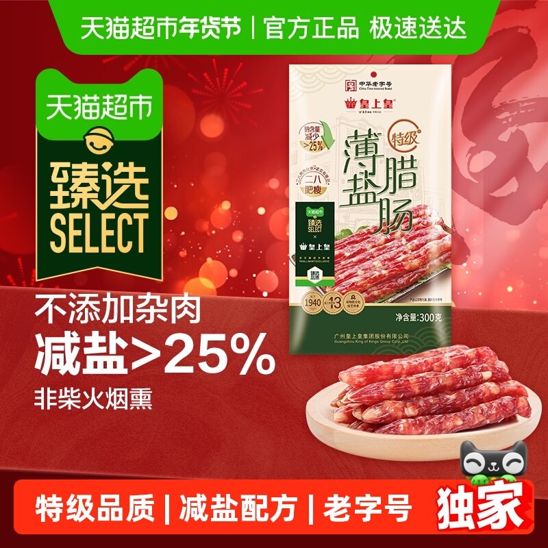 皇上皇特级薄盐腊肠臻选款!精选猪后腿肉,二八配比紧实不腻,减盐配方鲜而不齁。下单链接: https://uland.taobao.com/item/edetail?id=Q05jJrg0HQtBa6qaVo8fXMJTatQ-26VpOQjC6OK4N3AbTZw