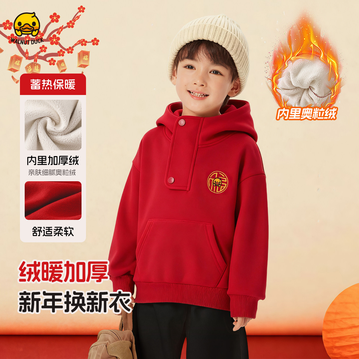 核桃小黄鸭这款新年儿童加绒卫衣太有年味啦!内里加厚奥粒绒蓄热保暖,柔软亲肤不闷汗,正红底色搭配精致小黄鸭刺绣,喜庆又可爱。券后29.7元起,多色多码适配男女宝,新年走亲访友、穿去幼儿园都吸睛,给娃囤一件暖乎乎的新年衣超省心~下单链接: https://uland.taobao.com/item/edetail?id=k3V0YmwBFYtaAmxYaGySG5rIPtJ-jGwQkK5TdYQMZJvkie