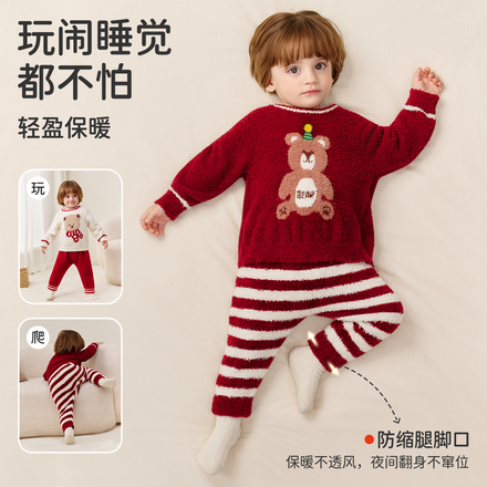 婧麒2025新款半边绒加绒儿童保暖睡衣套装