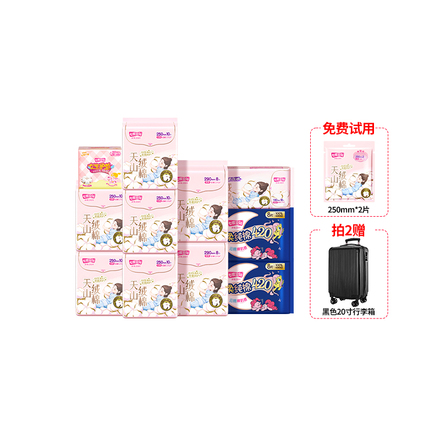 【下拉详情页加购前两个选项,淘金币抵扣10.99元,优惠券65元,官方立减37元,礼金8.22元,券后179.6,凑单消费券到手157.5元两套,下单赠20寸行李箱】【宋雨琦代言】甄选长绒棉,细腻亲肤;精粹乳霜,呵护娇嫩肌,独创内芯不惧潮涌;巾身加宽,有效防侧漏;优质长绒棉,低敏更亲肤,呵护敏感肌~【退货运费险】下单链接: https://uland.taobao.com/item/edetail?id=AkkxX8MUzt47ywg4w9hmwKivtn-6RmxkGoIy5gpojXwiKG