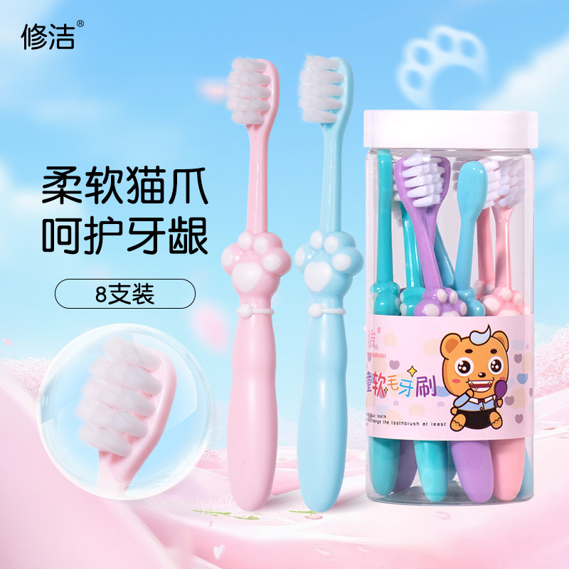 修洁儿童软毛牙刷8支装猫爪造型高密植毛